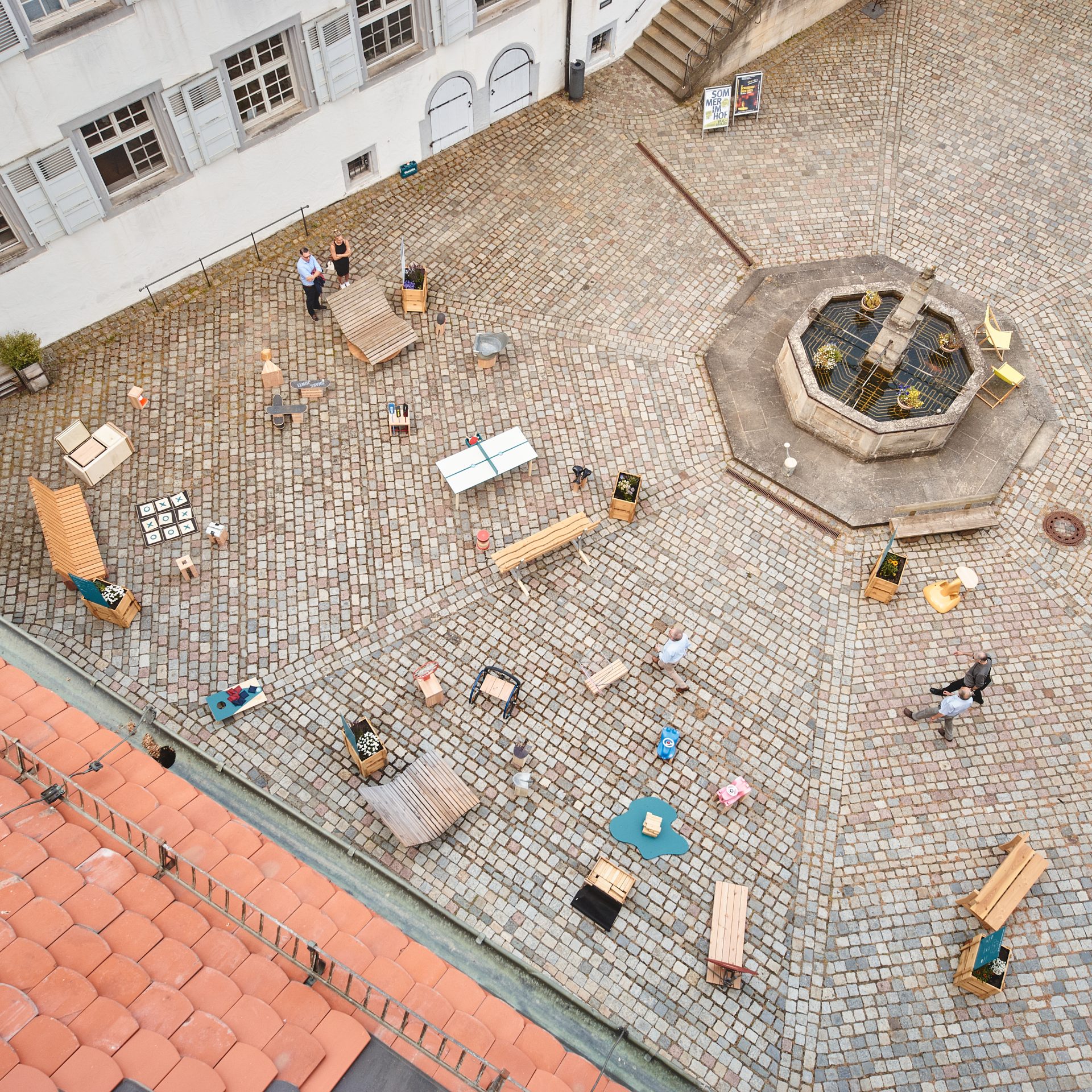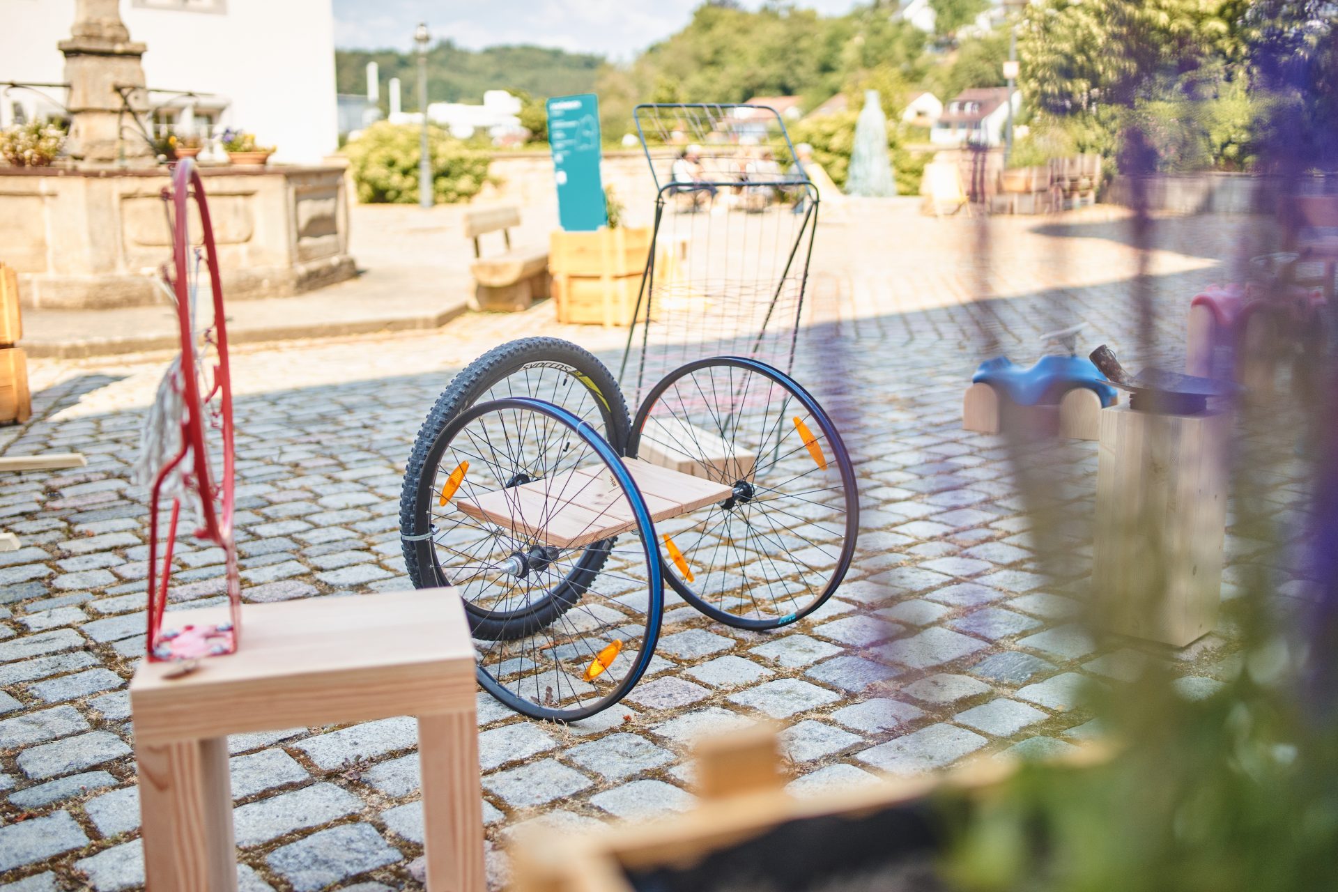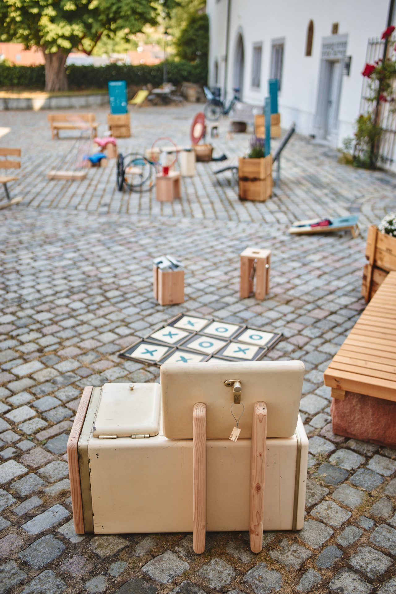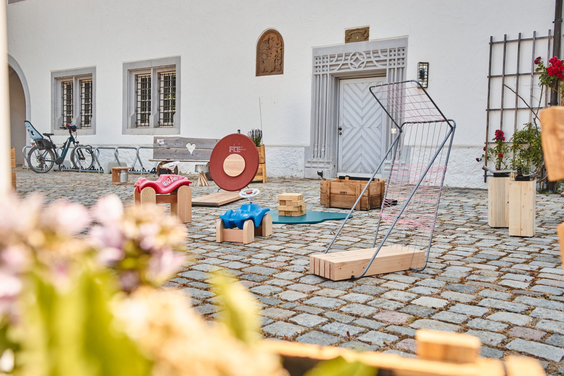Dabei haben sie alte, ausgediente Alltagsgegenstände in Kombination mit heimischen Douglasienholz in ungewöhnliche, bequeme oder herausfordernde, spielerische „Waldenbuch Hocker“ verwandelt. Diese luden die Besucher*innen des Museums den ganzen Sommer 2023 über zum Verweilen im Hof des Schlosses ein.
